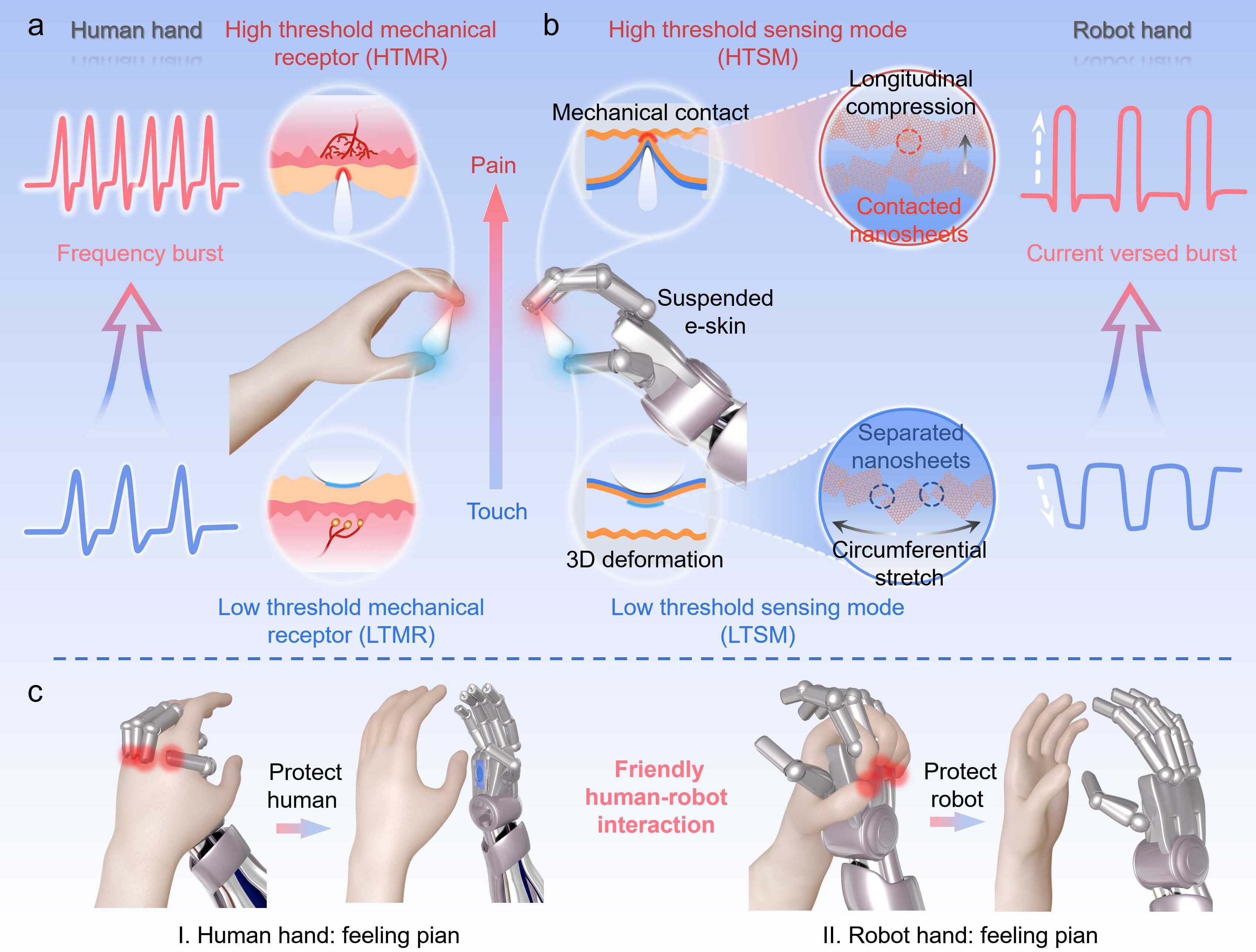 作为电子皮肤的重要分支,基于多种感知机制的柔性触觉传感器已被开发并成功模仿人体皮肤的触觉性能/功能。痛觉,作为另一种重要的感觉,可以帮助人类有效避免潜在危险并实现自我保护。近年来,研究人员通过采用突触型器件(如晶体管、忆阻器)或液态金属复合材料开发了人工痛觉感受器,实现无害和有害的痛觉感知。然而,人体皮肤的感知系统并不局限于单一的触觉或痛觉感知。相反,它表现出触觉和痛觉感知功能的高效耦合。因此,在人工感知系统中实现触觉和痛觉集成感知引起了越来越多研究人员的关注。