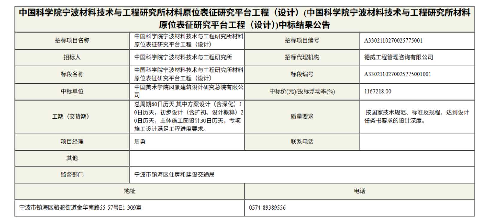 中国科学院宁波材料技术与工程研究所材料原位表征研究平台工程(设计)中标结果公告