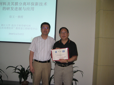 2010年7月8日下午,宁波材料所党委书记、副所长严庆为浙江大学教授徐又一颁发聘书,聘请他为宁波材料所高分子与复合材料事业部客座研究员。受聘期间,他将与该事业部的膜材料研究团队保持经常性交流,把握材料领域的科研方向,协助培养基层科研人员,指导提高和完善膜材料的科学研究。