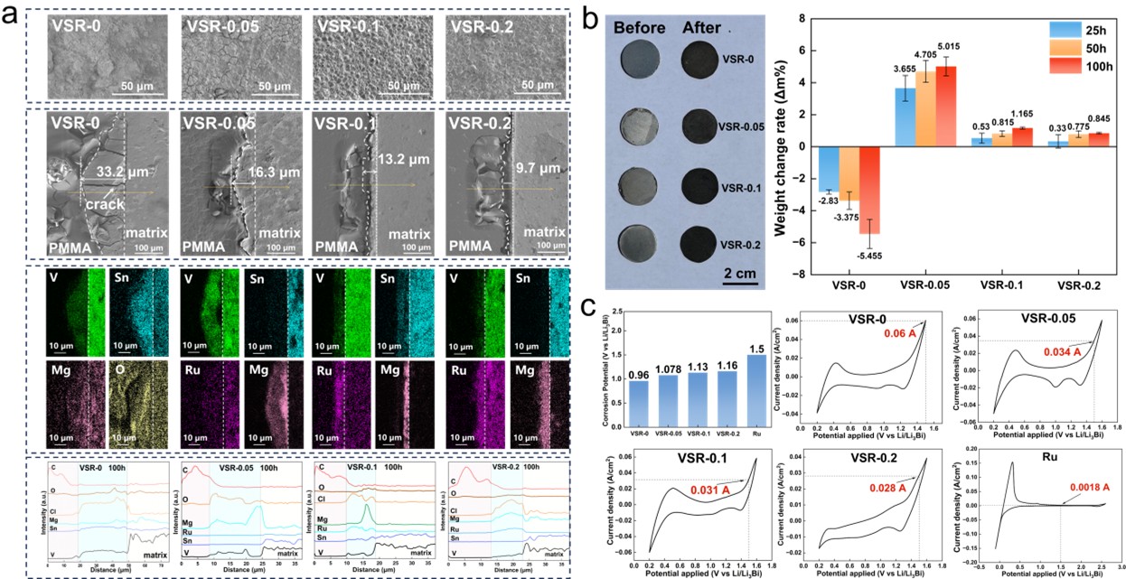 图1 MAX相材料A层引入Ru后前后腐蚀结果:(a) MAX相块体100小时腐蚀后的表面/截面SEM及元素分布谱图;(b) 腐蚀前后宏观表面形貌及质量变化:(c) 700℃熔融MgCl2-NaCl-KCl中五种材料电化学测试
