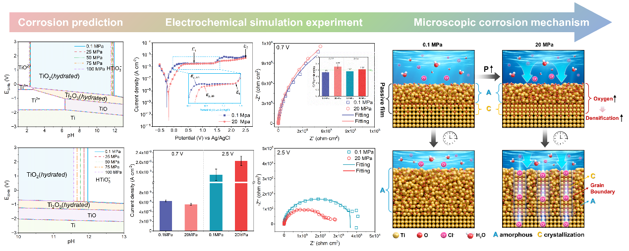 研究阐明了静水压力对钛钝化膜演化的双重调控效应:在钝化初期,高压环境会促进氧元素向钝化膜内部扩散,加速膜层生长并提升钝化膜稳定性,有效增强钝化膜的初期防护能力;在长期高压服役或膜层破损修复阶段,高压会诱导原本非晶态的钝化膜发生局部晶化,形成亚稳TiO晶相,产生的晶界形成离子渗透通道,削弱钝化膜的自修复能力,导致膜层阻隔性能降低。该研究厘清了钝化膜“非晶-晶态”结构转变与耐蚀性能衰减的核心机制,明确了钝化膜中氧含量、晶相结构是调控深海钛材耐蚀性的关键因素。