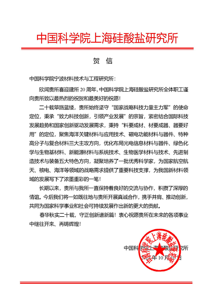 中国科学院上海硅酸盐所贺信