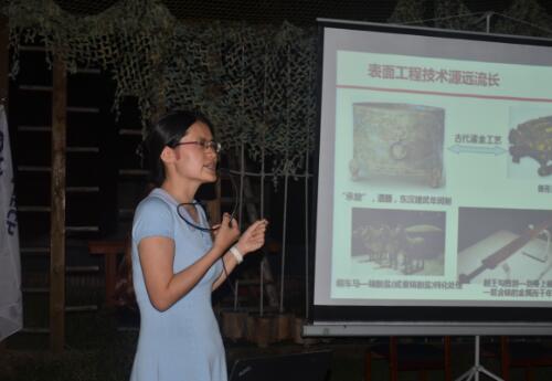 本次活动包括科普知识讲座和科学实验演示两部分。在读博士李蕾以《生活中的“面子”问题》为题,通过日常用品为例,讲解生活中无处不在的材料表面技术相关科学知识,并通过PPT演示、现场播放高速相机拍摄的视频,展示了表面材料科学的强大力量,揭示了科学的奥秘。她从 “荷叶自洁-出淤泥而不染”的现象入题,引出东汉年间酒器、越王勾践的剑等,说明了表面工程技术不是现代才出现,而是有着源远流长的历史;通过不粘锅、眼镜片、防水布料、鲨鱼皮泳衣、杭州湾跨海大桥、隐形飞机等实例,深入浅出地讲述了表面工程的原理和无处不在的应用。