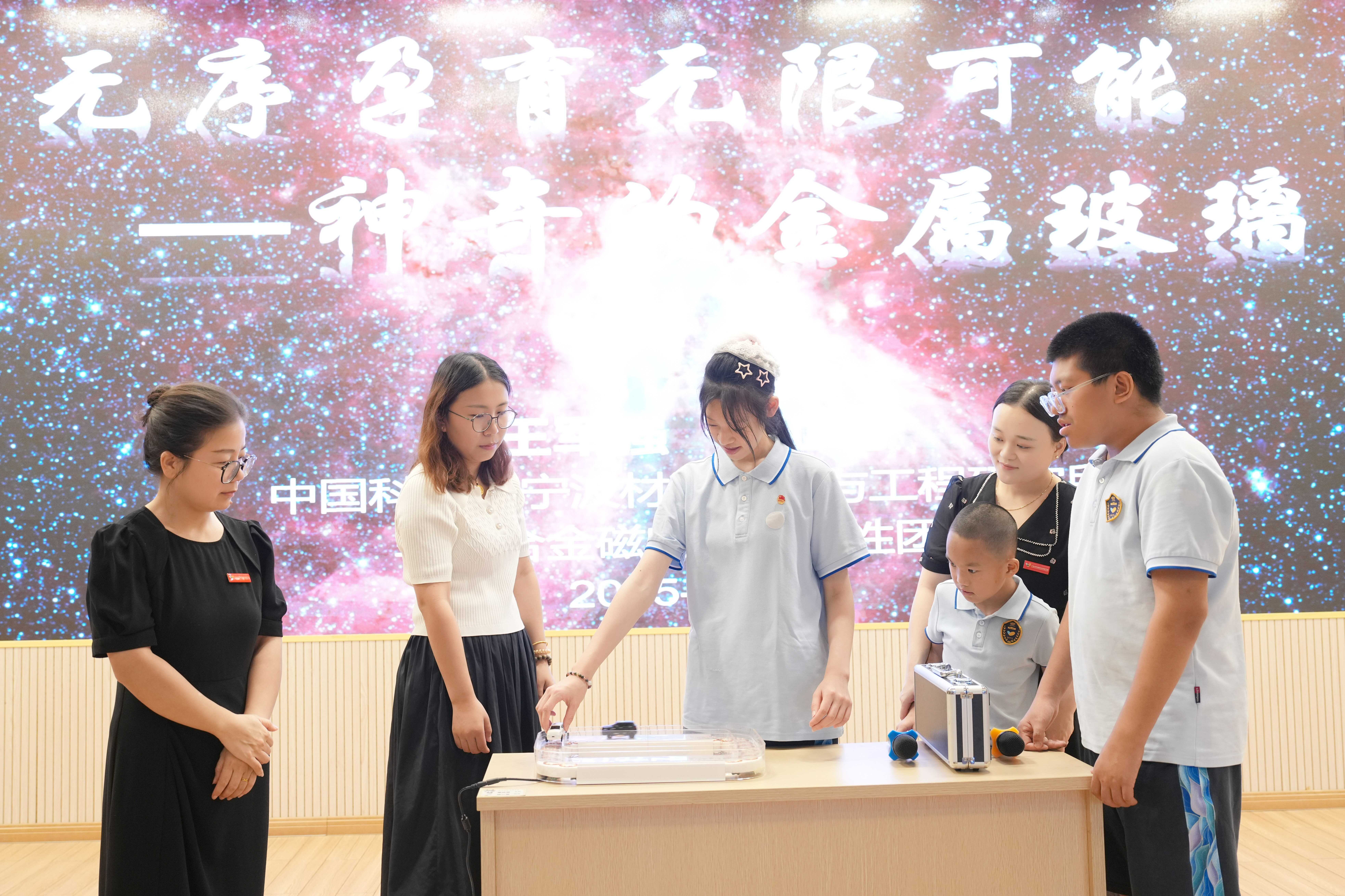 宁波材料所博士后陈亚男来自宁波材料所磁性材料及应用实验室,主要从事非晶纳米晶软磁材料的研究。在本次活动中,她为大家介绍了一种神奇的材料——金属玻璃,并结合我们的日常生活,详细地介绍了金属玻璃特殊结构、优异性能和在生产生活中的广泛应用等。考虑到特殊学生的需求,她还特别为同学们准备了互动实验环节,通过直观的展示、触摸体验等方式,让学生们亲身感受科学的魅力。