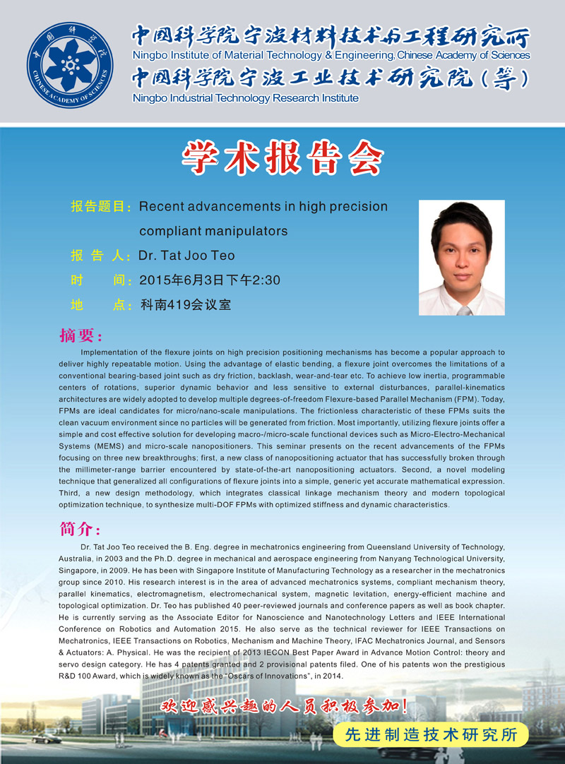 Tat Joo Teo:Recent advancements in high precision compliant manipulators 发布:2015-05-26 点赞: 字号:小 大 打印: