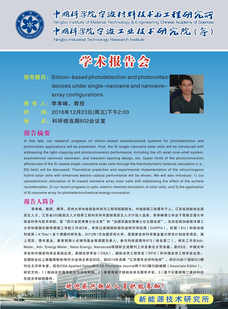 12月23日:李孝峰:Silicon-based photodetection and photovoltaic devices under single-nanowire and nanowire-array configurations 发布:2016-12-19 点赞: 字号:小 大 打印:
