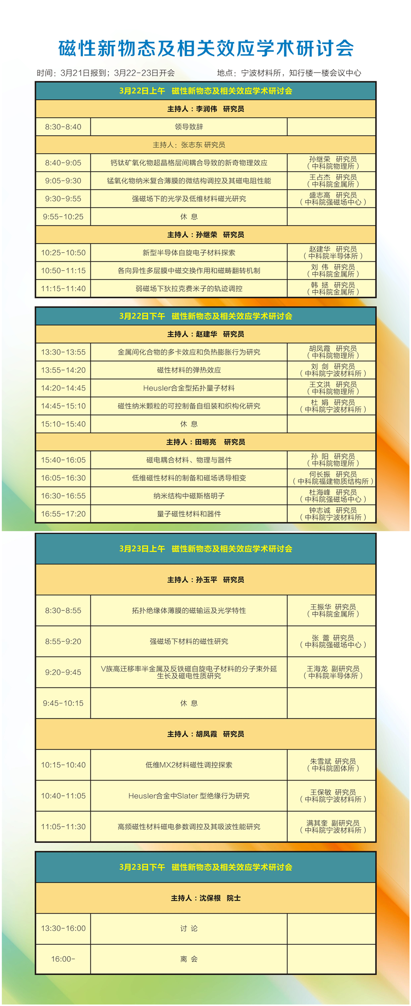 3月21-23日:磁性新物态及相关效应学术研讨会 发布:2017-03-17 点赞: 字号:小 大 打印: 时间:3月21日报到;3月22-23日开会 地 点:宁波材料所,知行楼一楼会议中心 主欢迎感兴趣人员参会! 附件1:会议议程