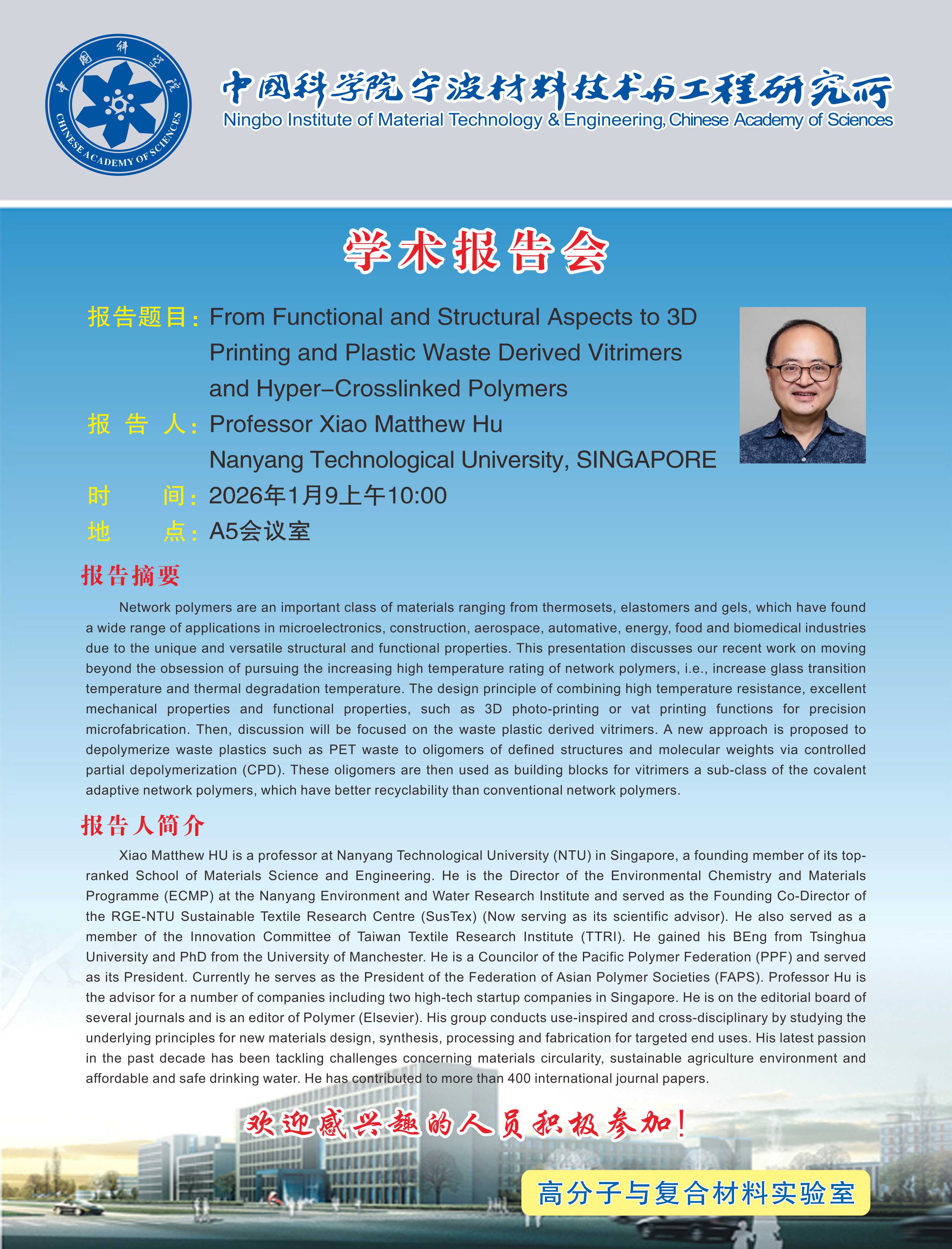 1月9日:Xiao Matthew Hu:From Functional and Structural Aspects to 3D Printing and Plastic Waste Derived Vitrimers and Hyper-Crosslinked Polymers 发布:2026-01-06 点赞: 字号:小 大 打印: