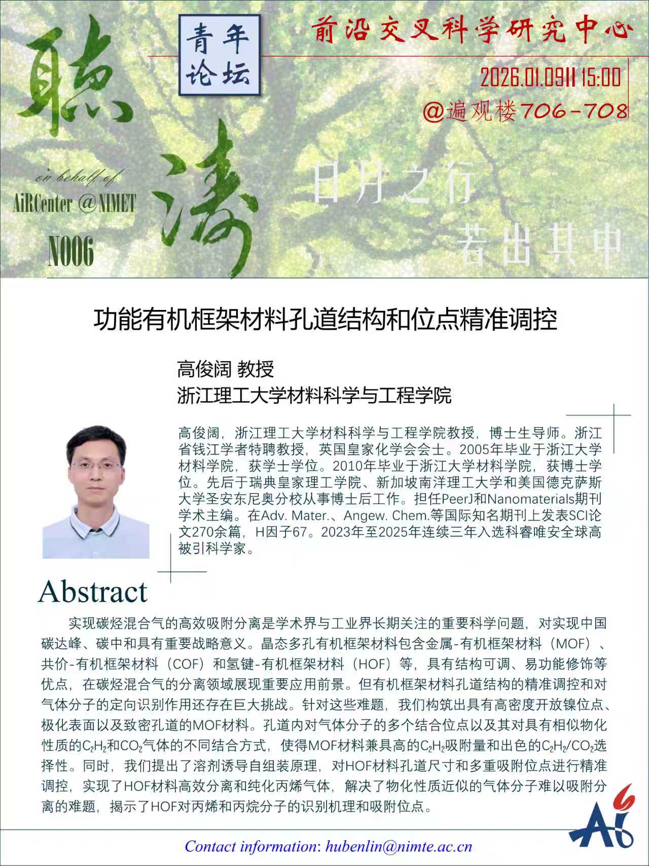 1月9日:高俊阔 :功能有机框架材料孔道结构和位点精准调控