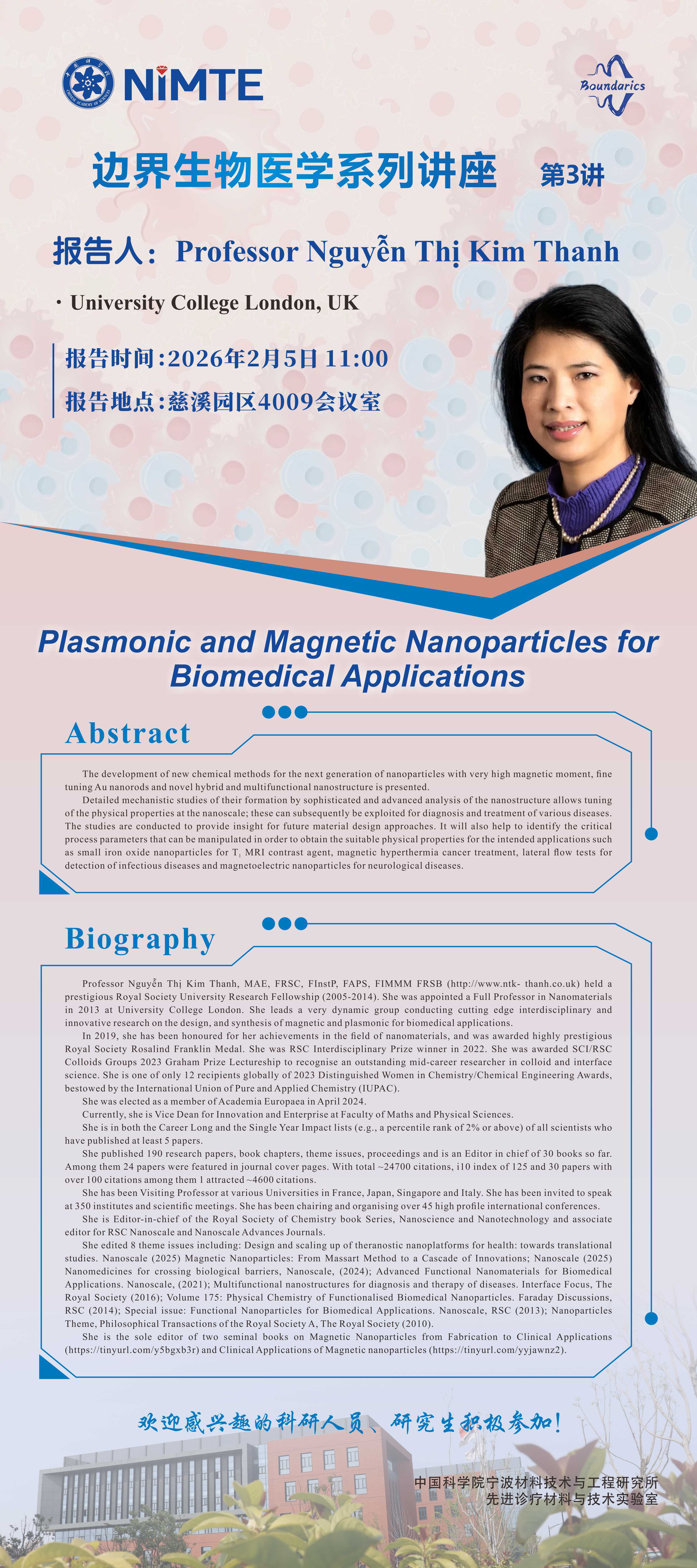 2月5日:Nguyễn Thị Kim Thanh:Plasmonic and Magnetic Nanoparticles for Biomedical Applications 发布:2026-01-30 点赞: 字号:小 大 打印:
