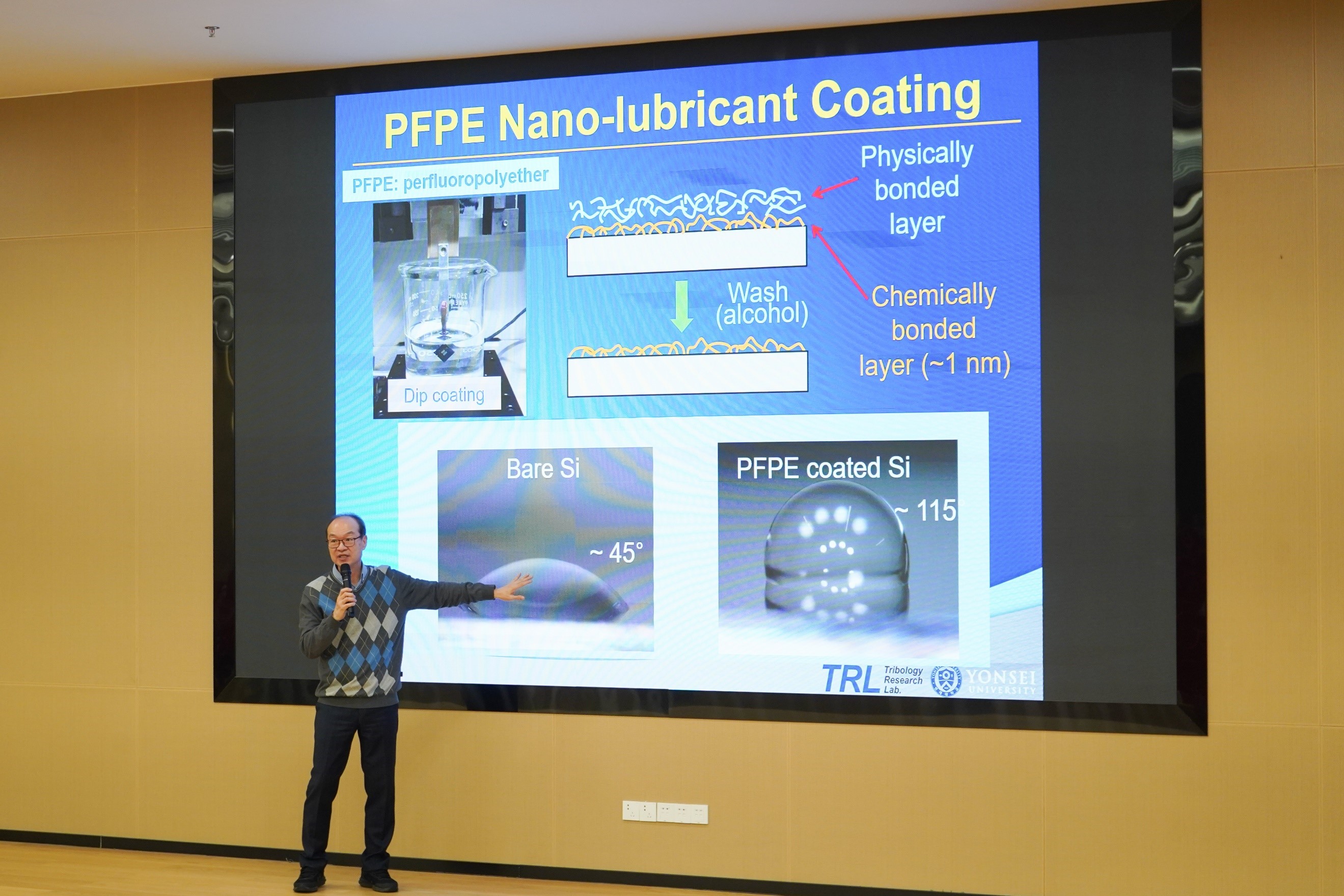 报告中,Dae-Eun Kim围绕微纳尺度摩擦行为和润滑重要作用,分析了摩擦学的基本概念、物理公式,及其对未来半导体、节能减排的科学意义。他以扫描探针和硅传感器套管为例,介绍了团队采用AFM精细表征纳米摩擦力和激光加工微织构在MEMS摩擦研究取得的最新进展和在长寿命微纳润滑领域的新成果。报告深入浅出,用简明生动的语言为大家清晰讲解了摩擦系数、磨损系数等在内的基本概念,现场气氛活跃。与会人员结合自身科研实际,就测试方法细节、涂层材料选择及未来摩擦学发展等方面等和他进行了热烈交流。