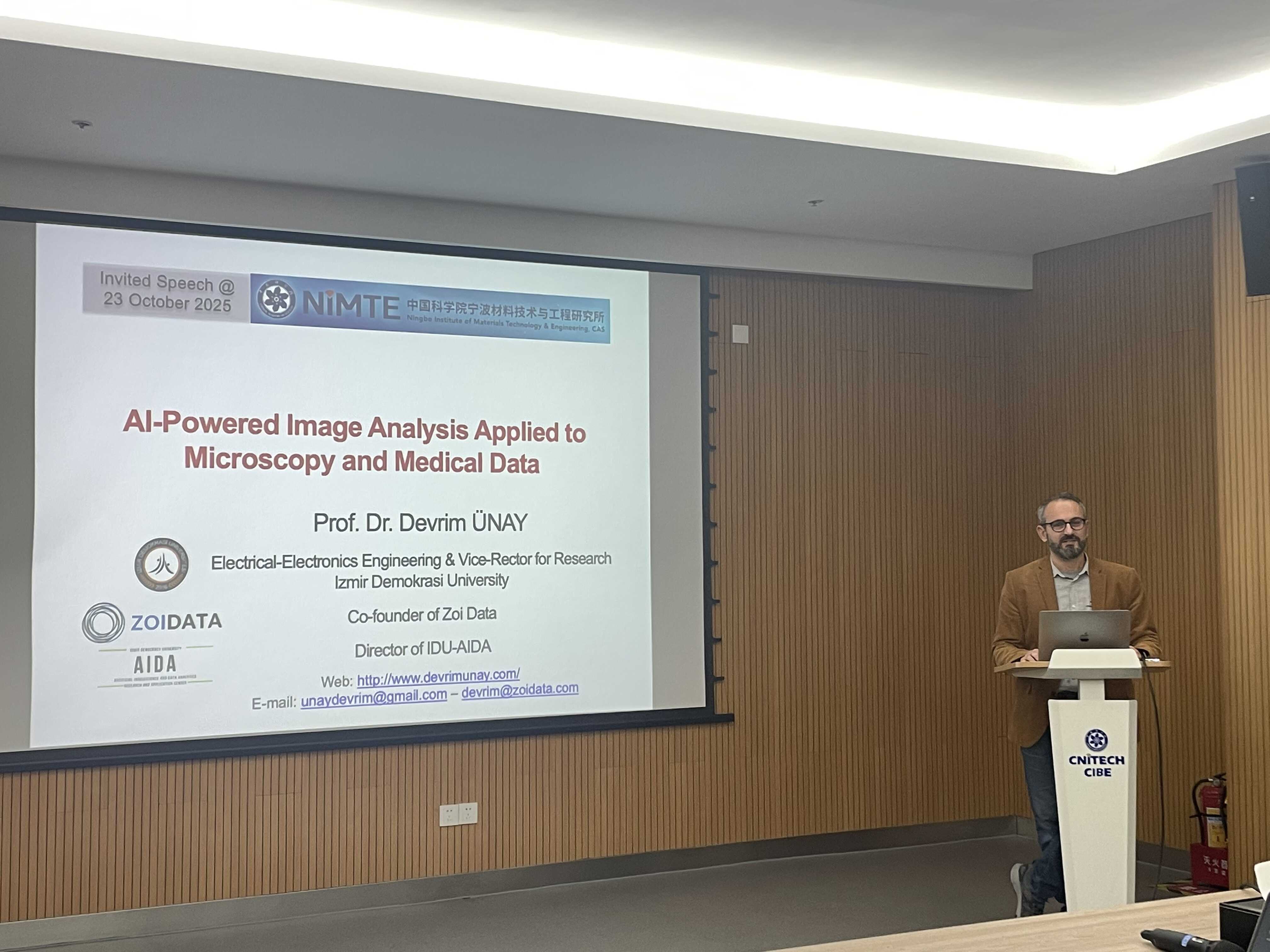 10月23日下午,中国科学院大学宁波材料工程学院生物医学工程前沿系列讲座2025年第15讲在慈溪园区4008会议室举行。本次讲座特邀土耳其伊兹密尔民主大学副校长Devrim Ünay教授作了题为Al-Powered Image Analysis Applied to Microscopy and Medical Data的学术报告。报告会由中国科学院宁波材料技术与工程研究所先进诊疗材料与技术实验室杨方副研究员主持。