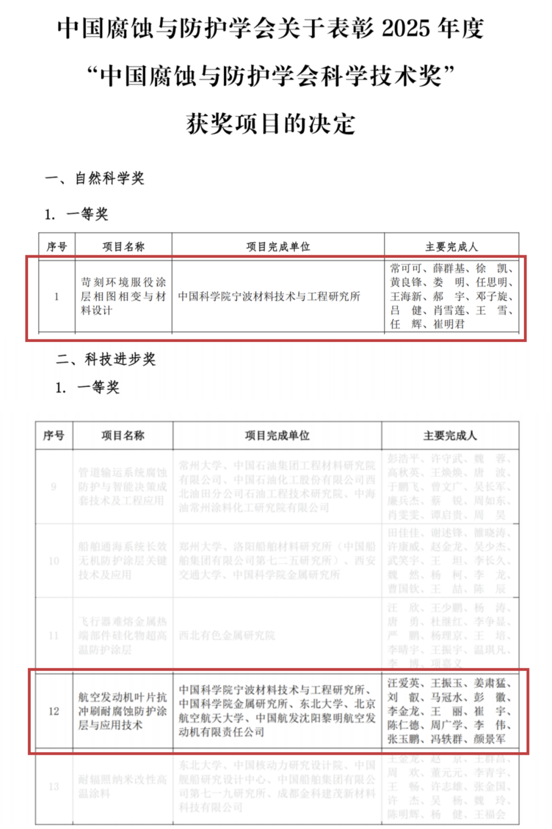 近日,中国腐蚀与防护学会正式公布2025年度“中国腐蚀与防护学会科学技术奖”获奖项目。海洋关键材料全国重点实验室在本次评选中表现突出,一举摘得两项一等奖,展现了实验室在腐蚀科学与防护技术领域深厚的研发实力与持续的创新活力。两项一等奖均由中国科学院宁波材料技术与工程研究所作为第一完成单位。