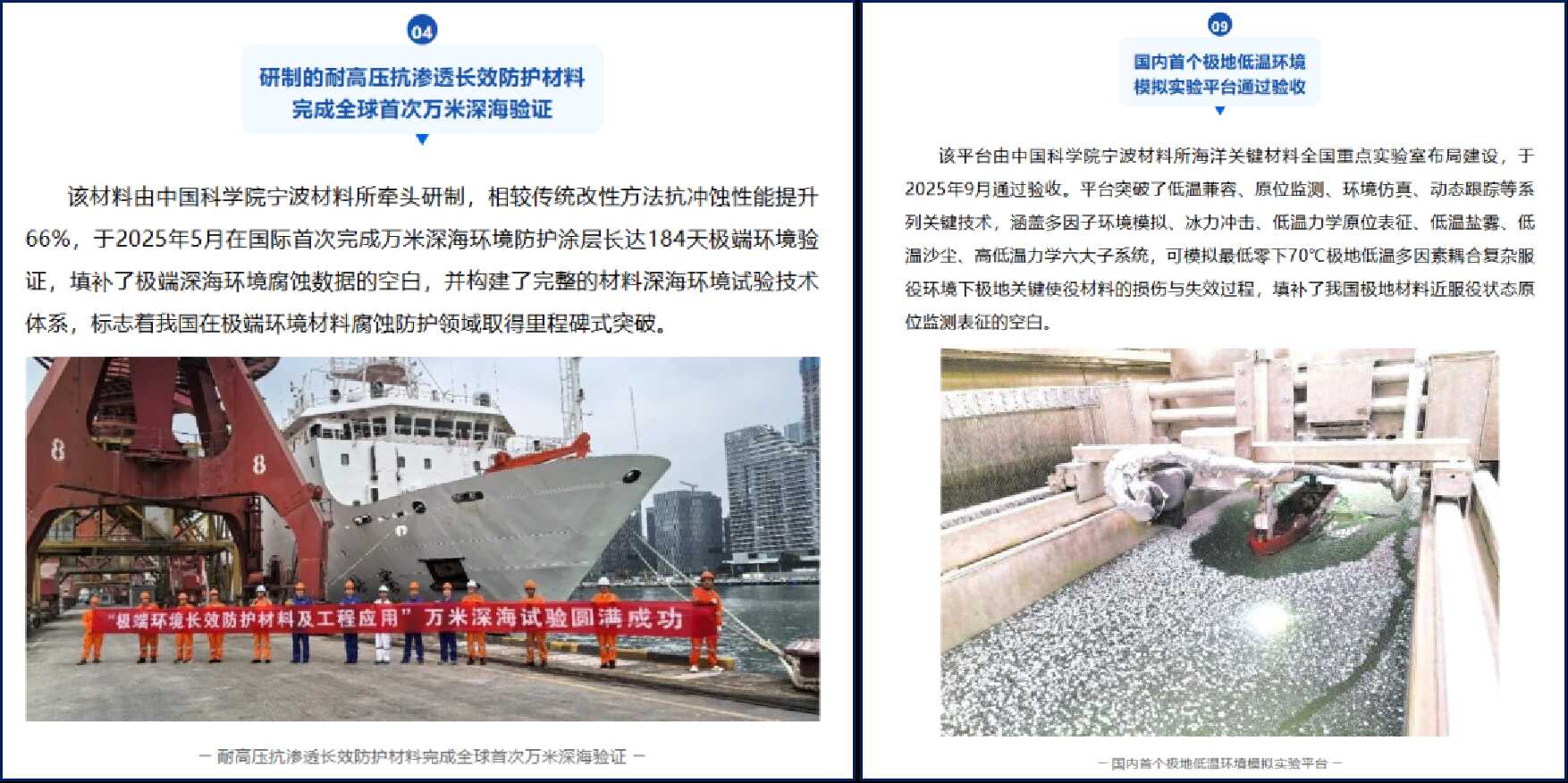 2月13日,浙江省海洋经济发展厅发布《蓝色引擎强劲驱动 2025浙江海洋科技创新硬核成果亮点纷呈》,集中亮相一批省内具有标志性、引领性的“硬核”创新成果。中国科学院宁波材料技术与工程研究所(以下简称“宁波材料所”)牵头完成的“耐高压抗渗透长效防护材料全球首次万米深海验证”、自主建设的“国内首个极地低温环境模拟实验平台通过验收”两项成果成功入选。