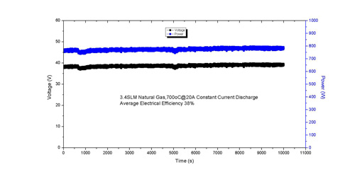 中科院宁波材料所燃料电池事业部系统设计与集成组,是一支跨专业综合性的团队,在事业部电池设计与生产组和电堆设计与制造组的积极配合下,先后承担了一家美国公司1kW发电与测试系统、文莱某大学1kW发电与测试系统、华电集团半山电厂5kW实地演示系统等项目。最近,该团队研发了1kW自热式独立发电系统,并成功运行,在全国范围内首次实现了真正意义上的产电、产能,迈出了从实验室走向家庭、市场的关键一步。该发电系统以民用天然气为燃料,尺寸类似于一台小型的电冰箱,在20A恒流放电时,可以连续稳定地输出约780W的电能,如图1所示。最高放电功率约870W,如图2所示,最大发电效率为43%,扣除系统自身耗电(约90W)后,系统最大发电效率约39%,与美国、日本等燃料电池公司报道的平均发电效率相当,达到世界先进水平。
