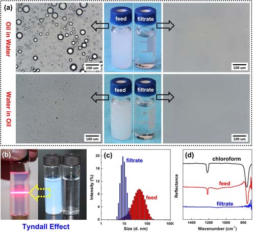 图 2 油水乳液分离实验效果 (a) 水包甲苯乳液 (上图) 和甲苯包水乳液 (下图). (b-d) 水包氯仿微乳液(b)Tyndall 效应(c)动态光散射检测液滴尺寸分布(d)过滤前后溶液红外谱图