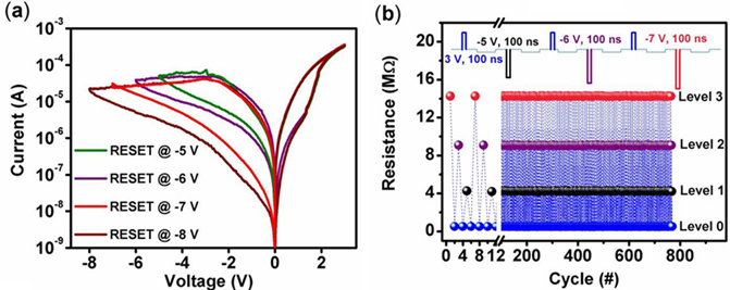 虽然基于给体受体型的有机非易失性存储器具有低功耗、高的翻转速度、良好的抗疲劳性和极好的尺寸扩展潜力从而被认为是新兴的下一代存储器候选对象。但是,基于给体受体型的有机材料的电阻转变过程难以控制,转变参数分布较宽;从而导致导致最终的RRAM器件状态的误读和编程错误。因此,找到一种对电阻变化过程可控的方法对于有机RRAM器件应用极为重要。另一方面,人们通常采用降低器件尺寸的方式来获得高密度的存储器。现在人们研究的存储器件的尺寸已经降低到了纳米尺度。在此过程中产生了诸如纳米尺度的制备及速度读写等新的问题。这些问题都阻碍了高密度存储器件的进一步发展。而另外一种提高密度的简单方法就是采用多态存储,这种方法无需额外的制备过程即可轻易地以指数量级提高存储密度。