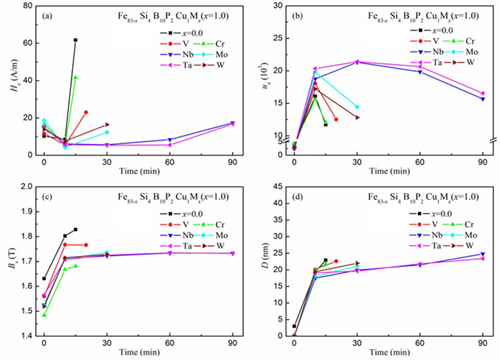 不同过渡金属微合金化后纳米晶合金磁性能随热处理时间的变化