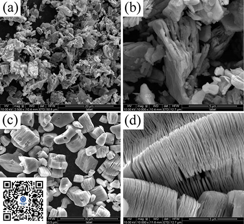 图(a)和(b)为MAX相粉体未经控制M/A化学计量比剥离后获得的MXene产物扫描电子显微镜微观形貌图片