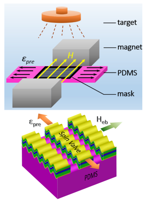 将磁性薄膜生长在柔性衬底并使之形成周期性褶皱结构,可以对应力进行有效的释放,从而保持薄膜磁各向异性的稳定性。然而,具有褶皱结构的磁性薄膜难以获得较大的磁各向异性,研究人员通过两种方式制备了具有周期褶皱结构的磁性薄膜:一种是在预拉伸状态下沉积缓冲层和磁性金属,然后释放预应力获得褶皱薄膜;另一种是在预拉伸状态下沉积缓冲层后进行应力释放获得周期褶皱结构,然后再在褶皱结构上沉积相应的磁性薄膜。研究人员对比了两种薄膜的磁性质,发现后一种方法制备出来的薄膜表现出更强的磁各向异性(Appl. Phys. Lett. 108, 102409 (2016))。