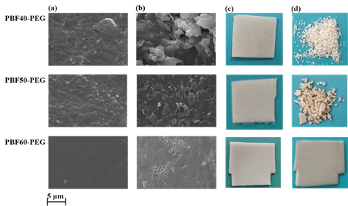 图3 PBF-PEG的共聚物在PBS缓冲溶液中的降解过程:(a) 降解前的表面;(b) 降解5周后的表面;(c) 降解前的宏观状态;(d)降解后的宏观状态