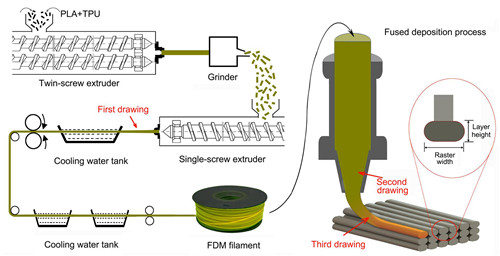 最近,研究人员以聚乳酸(PLA)为基体,以热塑性聚氨酯(TPU)为填料,通过熔融沉积技术的整个加工流程实现了弹性体TPU原位成纤,纤维状TPU的平均长度可以实现从67.24μm到103.72μm的精准调控。同时,TPU成纤有效改善了其与PLA基体的界面结合力。研究发现,3D打印形成的网格状TPU可有效补偿打印空隙对打印件力学强度的弱化效应,使产品的韧性达到甚至超过注塑水平。该熔融沉积原位纤维技术为制备高韧性聚乳酸复杂结构零件提供了简便有效的方法(Macromolecular Materials and Engineering, 2019, 1900107)。