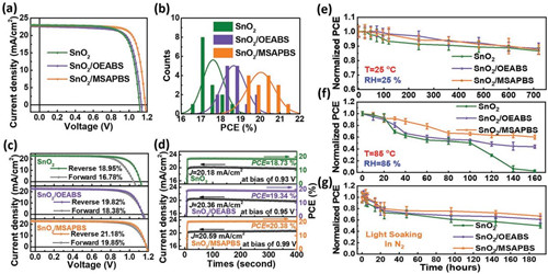 图3 (a)采用不同电子传输层的最优器件的J-V曲线, 器件性能参数统计分布(b), 器件的迟滞特性(c), 器件的稳态输出(d), 器件的湿热稳定性测试(e,f)和光照稳定性测试(g)