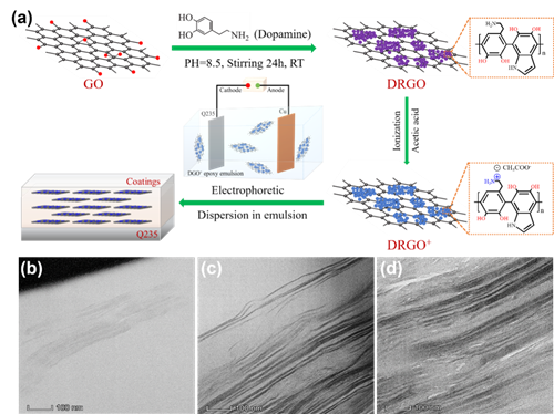 图1 (a) 新型阳离子DRGO+纳米片制备过程示意图;不同DRGO+含量涂层内部石墨烯排列分布图:(b) 0.25%, (c) 0.5%, (d) 1.0%