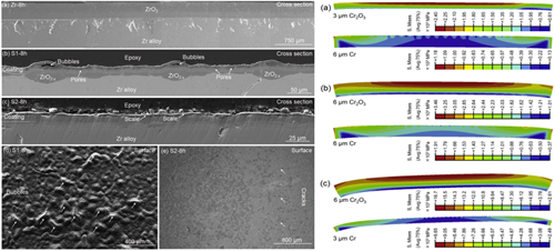 图1 梯度涂层经高温水蒸气氧化后的表/截面结构(左)和应力场分布图(右)
