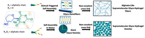 近日,中国科学院宁波材料技术与工程研究所生物医用高分子材料团队陈静副研究员和法国国家科学研究中心植物大分子研究中心S. Halila研究员(中科院PIFI国际访问学者)等科研人员报道了一种合成两亲性糖基化衍生物的新方法,通过精心设计疏水段的结构,获得了具有多级超分子自组装纤维状和囊泡状的糖基化水凝胶(图1)。