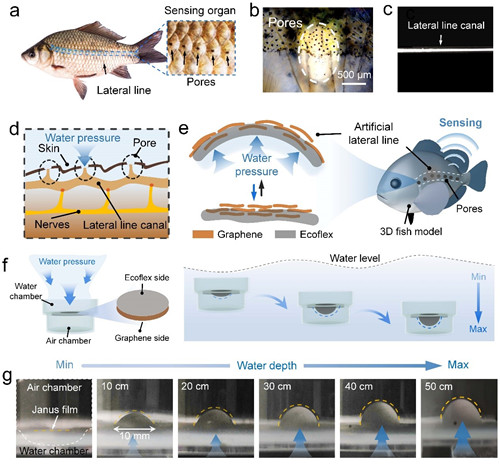近期,中国科学院宁波材料技术与工程研究所陈涛研究员、肖鹏副研究员基于在碳基/高分子复合薄膜的构筑及其柔性传感器方面的研究基础(ACS Nano, 2019, 13, 4368; Nano Energy, 2019, 59, 422; Nature Commun., 2020, 11, 4359; Nano Energy, 2021, 81, 105617; Adv. Funct. Mater., 2021, 31, 2105323; Nano-Micro Lett.,2022, 14, 32等),受能够感知水深及周围振动的鱼侧线传感系统启发,开发了一种仿鱼侧线水下机械传感器,可实现高效水下探测与振动监测。