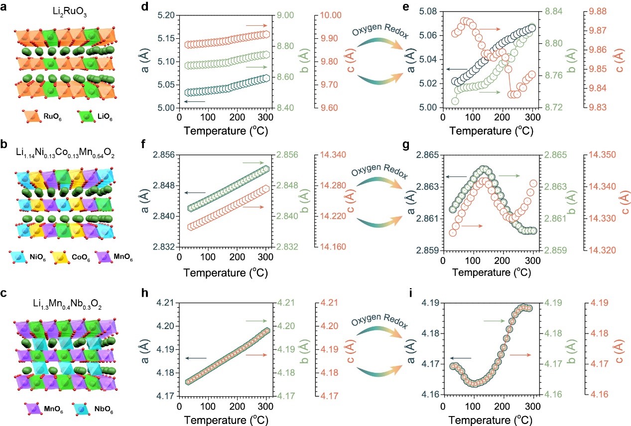 研究团队通过原位加热同步辐射X射线衍射(SXRD)表征技术,首次捕捉到富锂锰基正极材料在高温下的反常收缩行为,并证实了这种现象在其它氧活性正极材料中的普适性。这一反常现象有悖于传统固体材料普遍遵循的“热胀冷缩”规律,具体表现为:在150℃-250℃温域内,富锂锰基正极材料晶胞体积不仅未随温度升高膨胀,反而表现出反常收缩的负热膨胀(NTE)效应。这一发现突破了经典热膨胀理论的解释框架,揭示了结构无序性对材料热力学行为的特殊调控机制,为新型功能材料设计提供了全新方向。这一现象首次将结构无序性与晶格热力学行为直接关联,为理解氧活性正极材料体系的复杂储能机制提供了新视角。