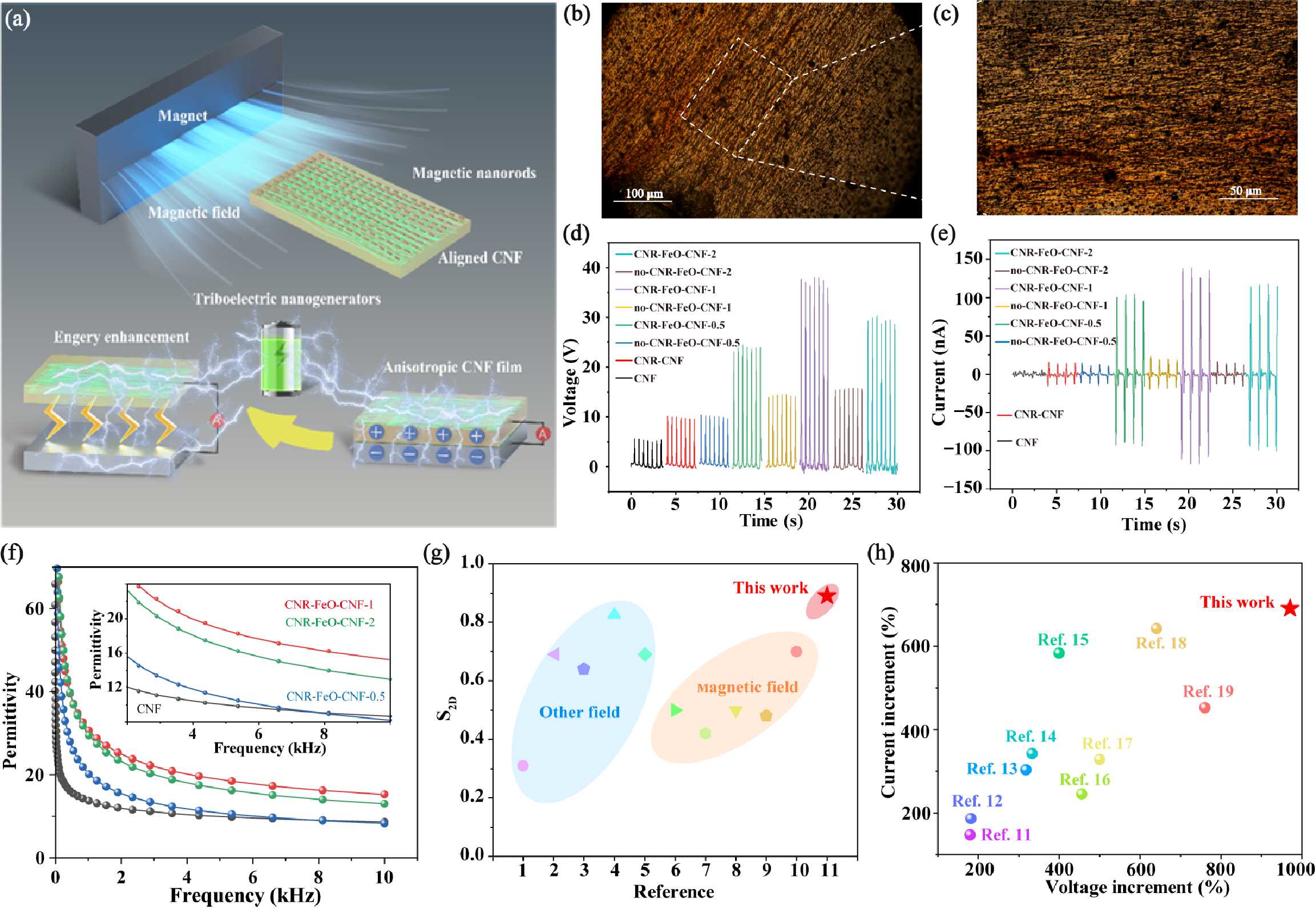 图(a)磁场诱导磁性纳米棒取向纳米纤维素提高TENG输出性能示意图;(b)、(c)高度排列纳米纤维素偏光显微镜图;(d)、(e)磁场取向纳米纤维素与随机分布纳米纤维素构成TENG输出性能图;(f)各向异性纳米纤维素膜介电常数图;(g)以磁性纳米棒诱导CNF取向与传统非磁场取向和磁场取向CNF的S2D对比图;(h)以磁场诱导高度取向的CNF与其他增强TENG输出性能方法的性能提升幅度对比图