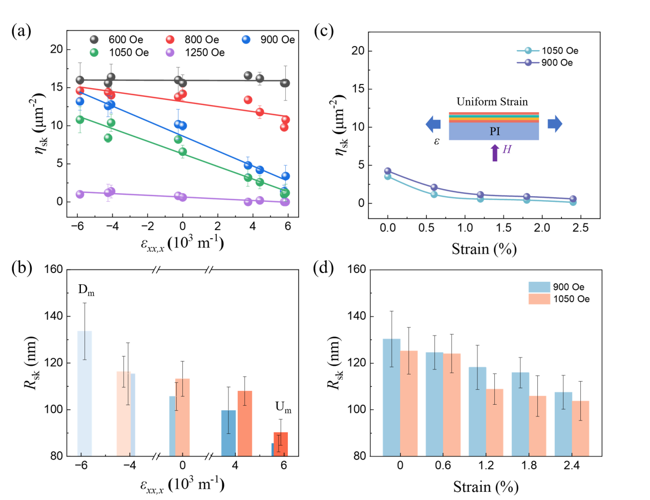 研究中,团队选择具有磁斯格明子结构的Pt/Co/Ta多层膜作为研究对象,采用预拉伸弹性聚二甲基硅氧烷(PDMS)衬底并结合磁控溅射技术,利用薄膜与衬底间的模量差异,在预应变释放后的Pt/Co/Ta薄膜中成功构筑了微褶皱结构,从而引入非均匀应变分布:褶皱结构的波峰位置受到拉伸应变,而波谷位置受到压缩应变,由此产生面内应变梯度。磁力显微镜观测显示,不同磁场下斯格明子的密度与尺寸呈现显著空间非均匀性,并在褶皱波峰两侧出现不对称分布:在负应变梯度区域,斯格明子更易稳定存在,密度更高、尺寸更大;而在正应变梯度区域则相反。利用面内应变梯度,斯格明子密度可在1-13 μm-2范围内连续调节,尺寸调控范围达85-133 nm,该调控效果甚至优于均匀应变的作用。