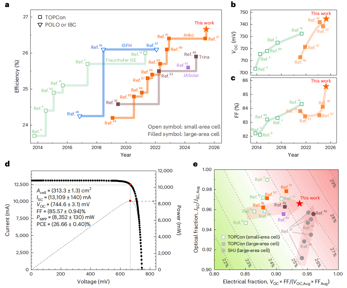 为攻克上述技术难题,中国科学院宁波材料技术与工程研究所光电信息材料与器件实验室叶继春研究员团队联合晶科能源股份有限公司、苏州大学、中国计量大学等单位,开展协同技术攻关,深挖技术瓶颈背后的关键科学问题,提出了一种双面电学协同优化的全新策略,成功实现了工业级TOPCon太阳能电池性能的重大突破。研究团队在工业标准M10尺寸(313.3 cm2)硅片上,成功制备出经认证转换效率达26.66%的TOPCon太阳能电池,同时创下744.6 mV的工业级TOPCon开路电压新高,填充因子达85.57%,双面率提升至88.3%,其Voc×FF/理论极限值达93.8%,远超行业此前水平,进一步推动了TOPCon技术向理论效率极限迈进。